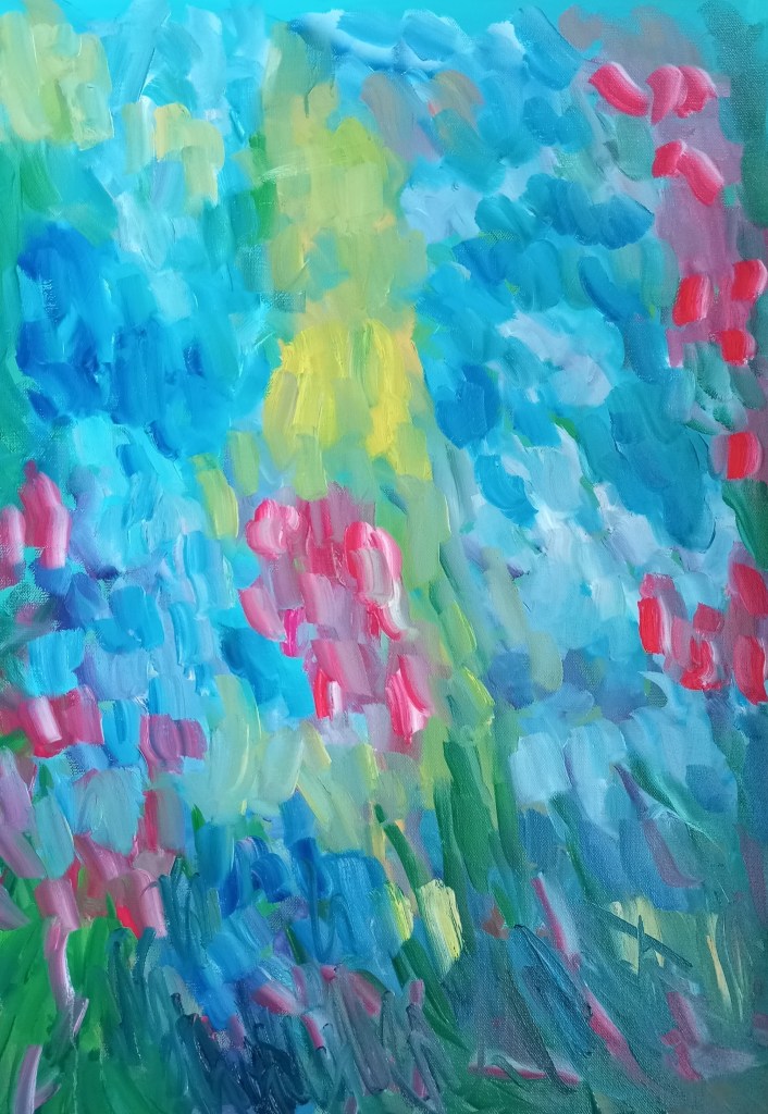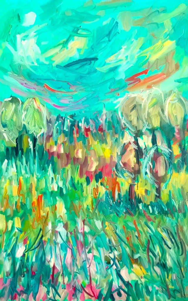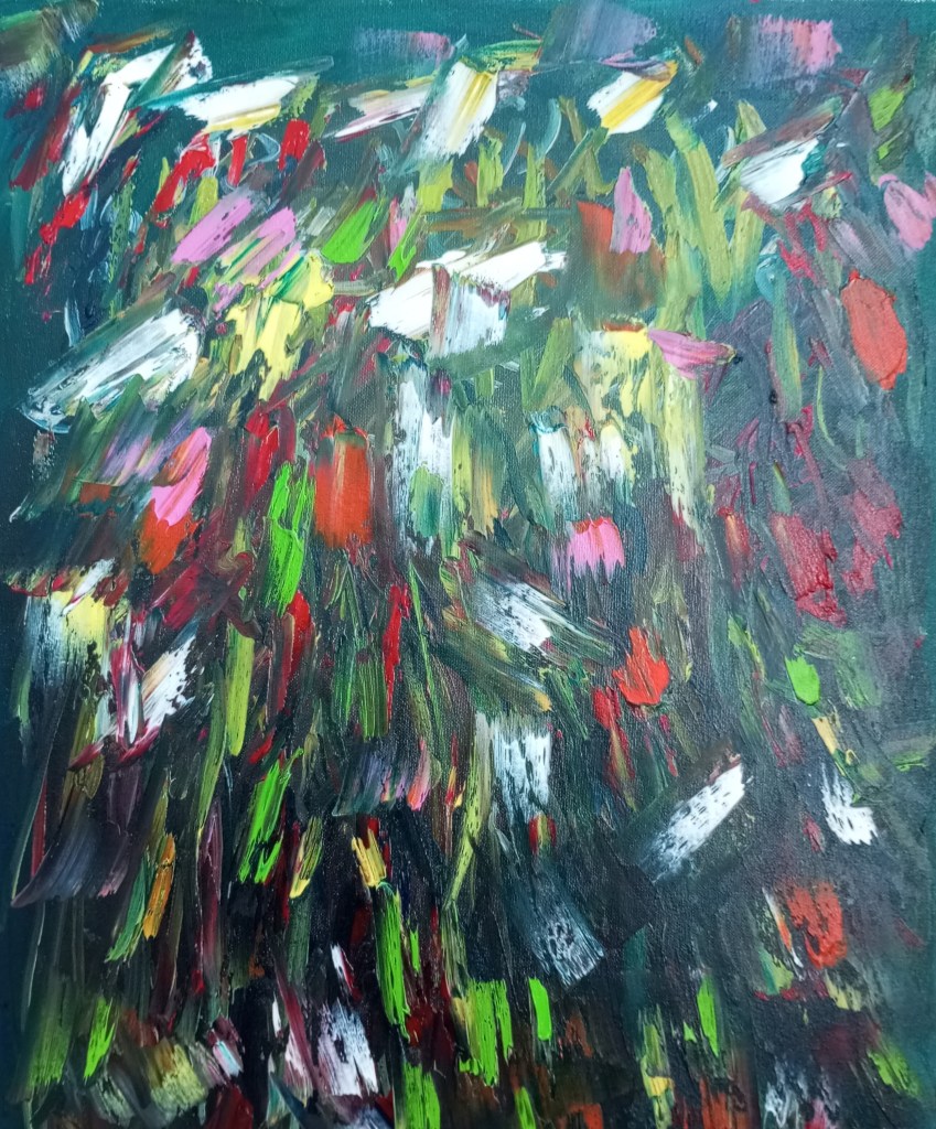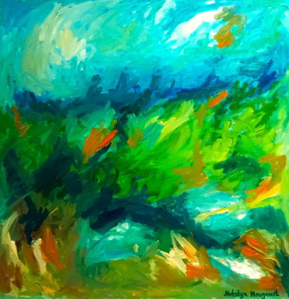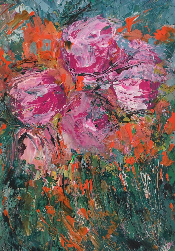 Natalya’s abstract paintings are a captivating exploration of the natural world, as she skillfully intertwines elements of nature, flowers, landscapes, and human figures. Through her unique approach, she transcends traditional representations, opting instead to express the essence of these subjects through a dynamic interplay of color and movement.