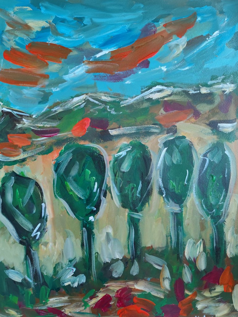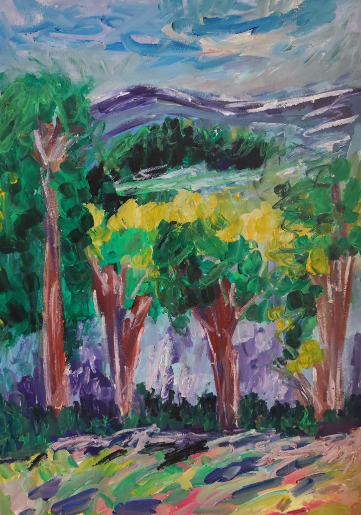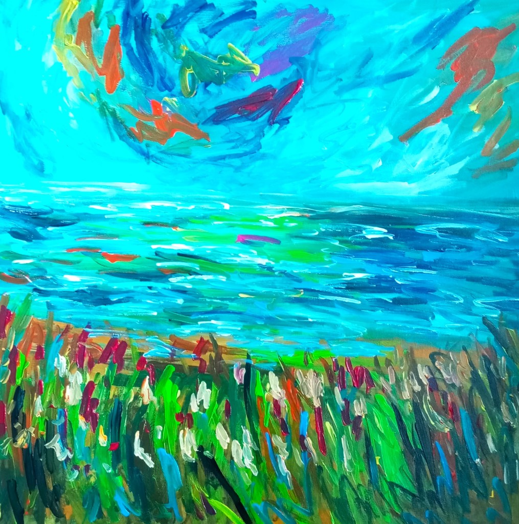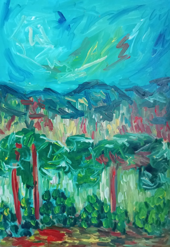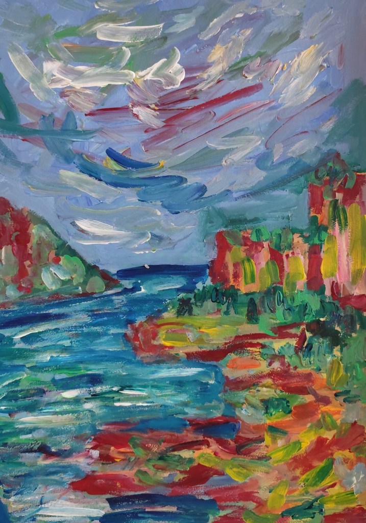 With its vibrant sceneries and strong brushstrokes, Natalya captures the essence of nature. A serene, far-off horizon beneath a sky brilliantly painted in swirling whites and blues is evoked by her depictions of the ocean, sea, beaches, forests, hills, trees, flowers, mountains, and valleys. The paintings from “Nature” series stand out for their vibrant compositions and tasteful color schemes, which beckon the observer to enter a vibrant natural setting and feel the interaction of light and shadow as though they were actually there.